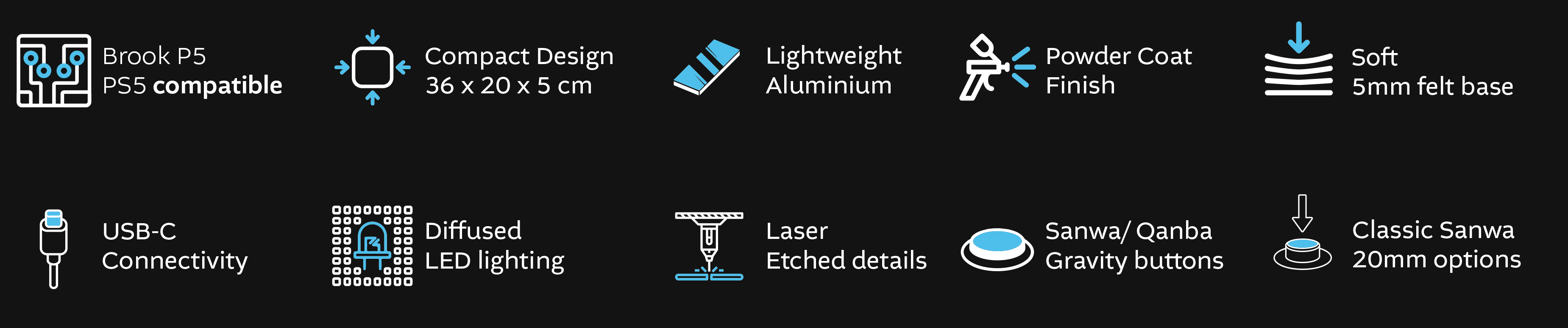 From the selection of the best components such as the Brook P5 Plus to the precise placement of Sanwa or Gravity buttons, each element has been thoughtfully integrated to ensure optimal performance and an immersive gaming experience. Our dedication to design excellence is evident in every aspect of our controllers; from the laser etched graphics to the durable top coat, making them a testament of our commitment to delivering the very best.